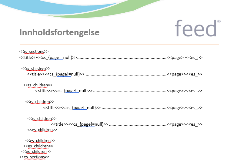 Disse er litt spesielle og her anbefaler jeg at dere tar en titt i vedlagt eksempel for å se hvordan man kan bygge opp disse for å få riktig struktur. I en mal av denne typen så har en tilgang til to spesielle "tags" som benyttes for å skrive ut riktig tittel og sidetall for kapitler(mapper) i katalogen. <<title>> for mappenavn, og <<page>> for sidetall. En kan så bygge opp en fortegnelse med å lage seksjoner for hvert "nivå" i strukturen som en ønsker skal inngå. I eksempel under er det en ToC som støtter 5 nivåer. Hvert nivå har da sin egen seksjon som itererer over sin undernivåer (children). Med å manipulere på hvor mange sliker seksjoner med "children" en inkluderer kan man styre hvor "dypt" i strukturen innholdsfortegnelse skal gå. I selve strukturen så kan en også velge om en mappe skal inngå eller utelates fra ToC.
