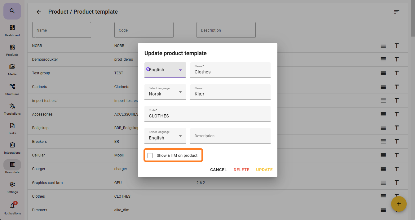 ETIM-fanen kan styres via produktmal. Dette gjør at ETIM-fanen kun vises på produkter der malene tillater det, og kan skjules der ETIM ikke er relevant.
