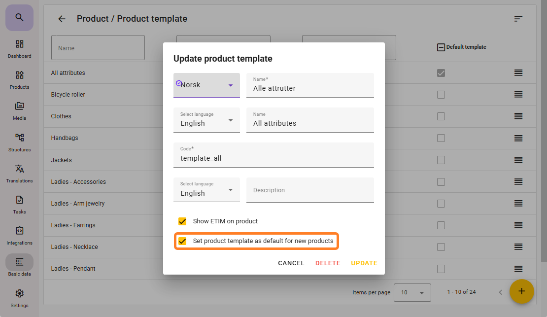• Åpner funksjonen for å velge hvilke attributter som skal være synlige for den valgte produktmalen
