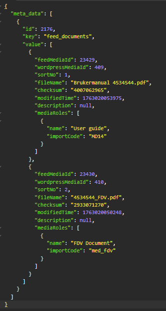 Da vil metadata-feltet "feed_documents" bli fylt ut med all nødvendig data for at en integrasjon kan vise eller ha link til WordPress-dokumentet på produktet.