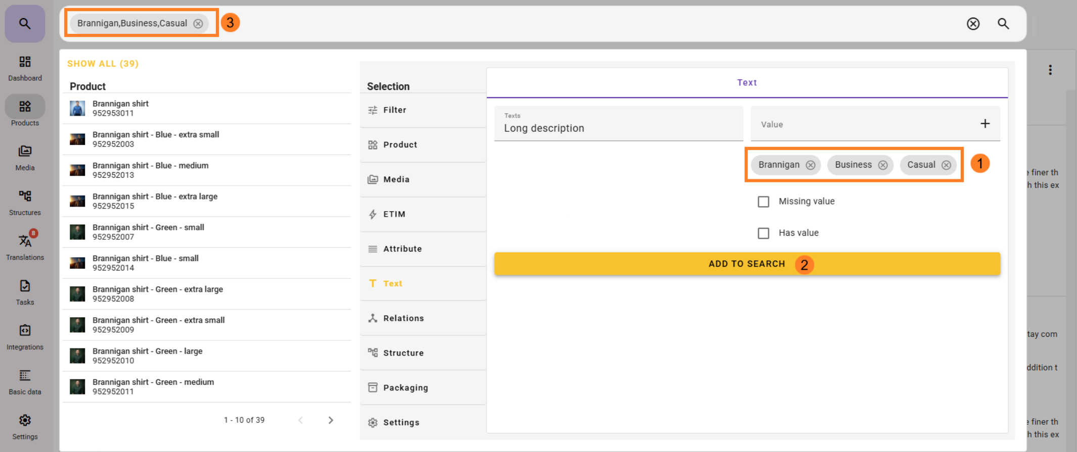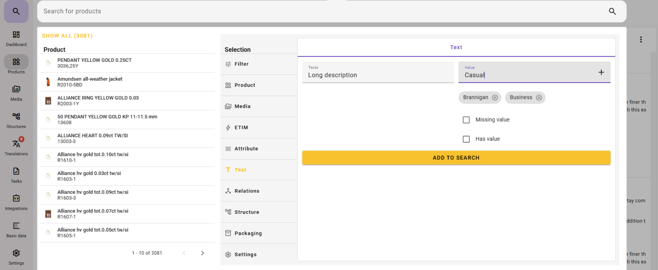 - Click on Text under Selection in Search and select a text field.