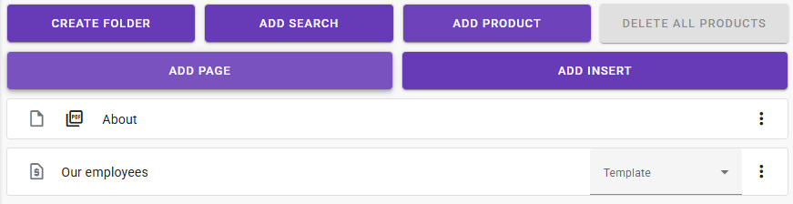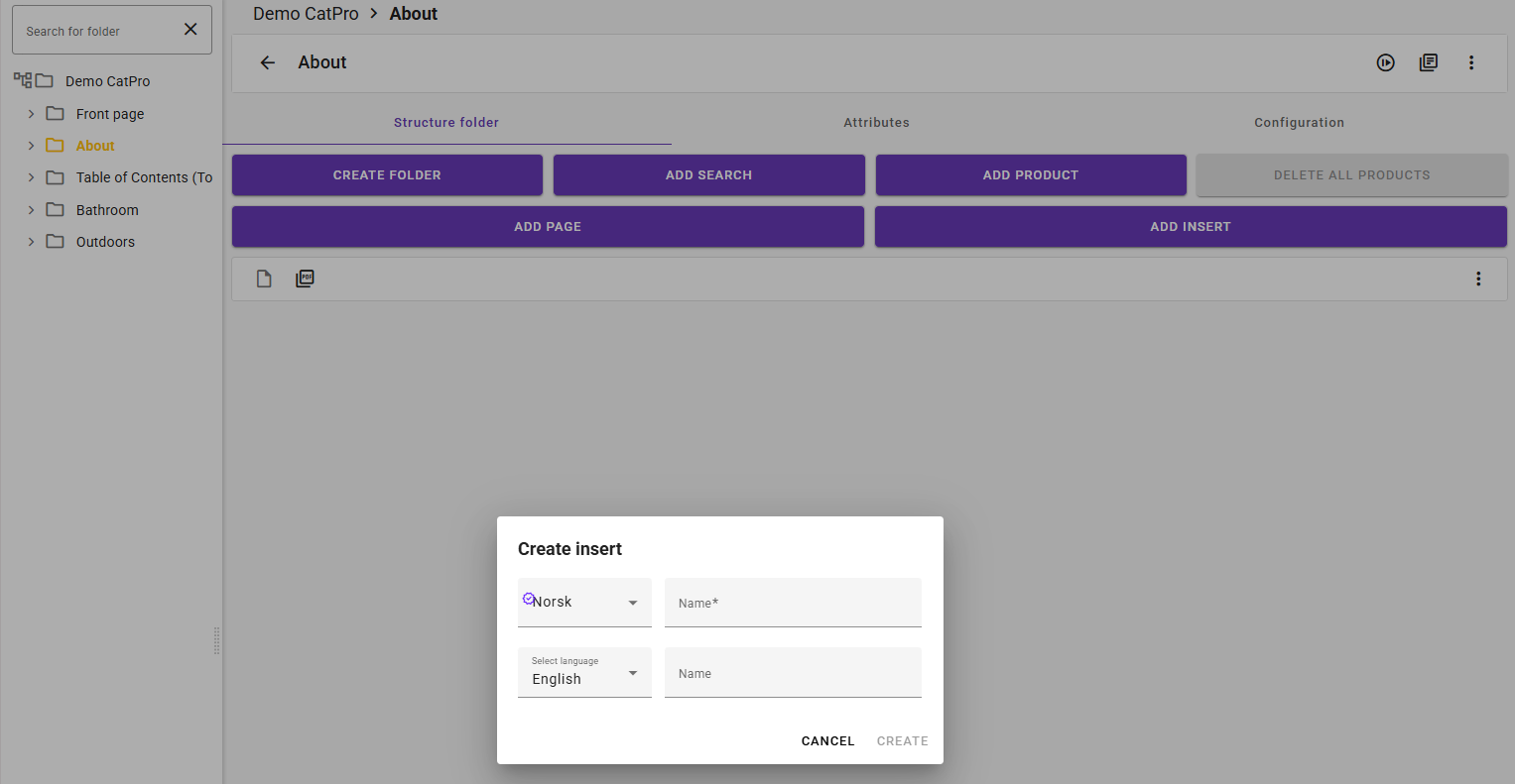 In any case, it is easy to merge an existing PDF into the finished catalog by creating an Insert node where you want it to be placed. Click “Add Insert”, give it a suitable name, and click “Create.” You will then get an Insert node under the folder, where, via the context menu on the right, you can upload or link a PDF from the media bank.
