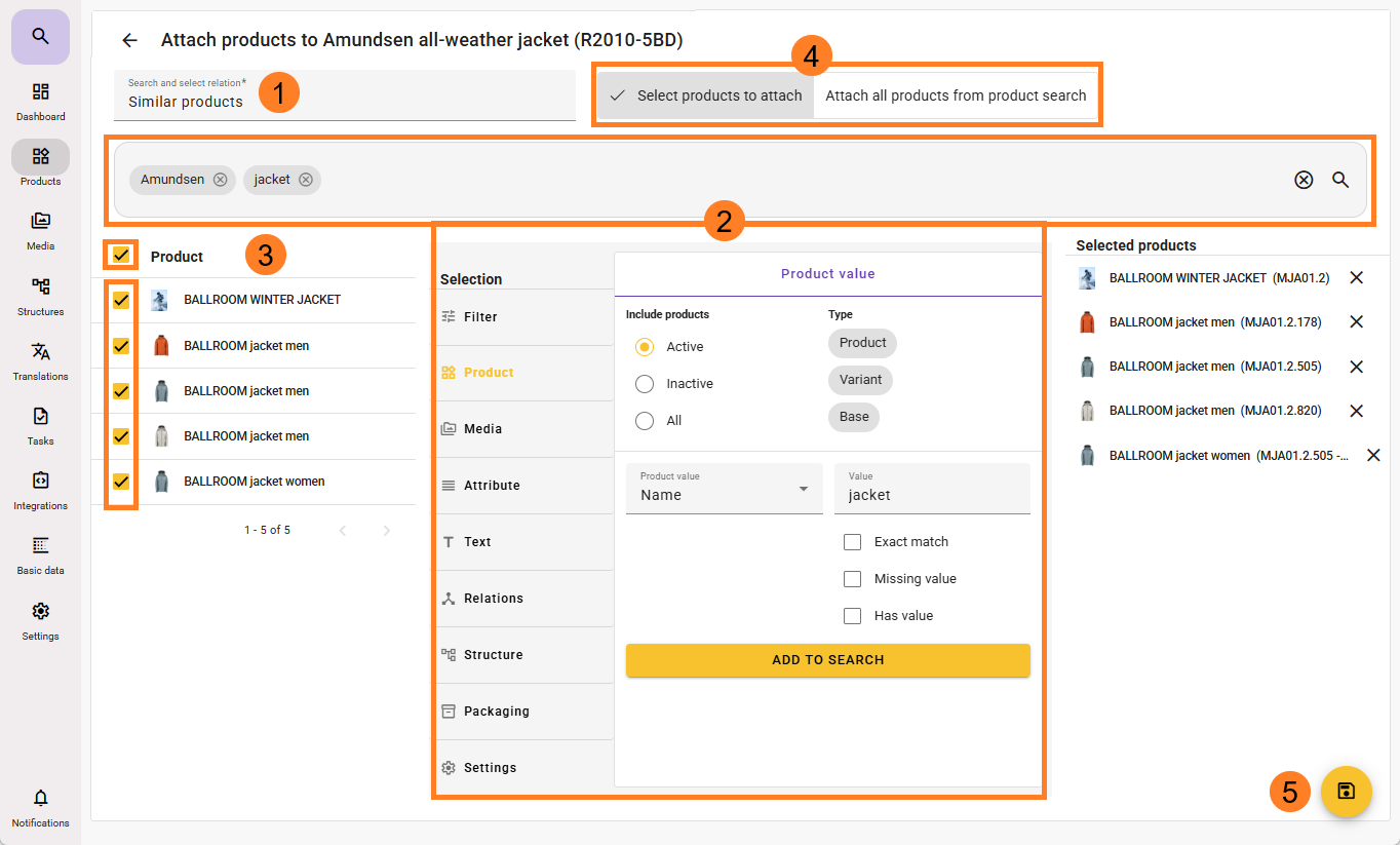 This will open a separate dialog where you can select predefined relationship types from the base data and search for the desired related products to attach to the product.