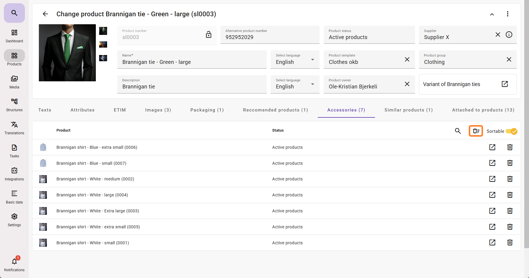 If you are working on a new product that, for example, should be a spare part for many other products, it makes sense to create an attachment to products.