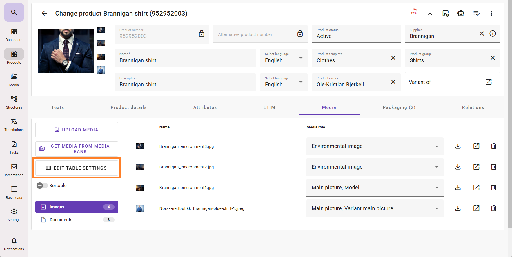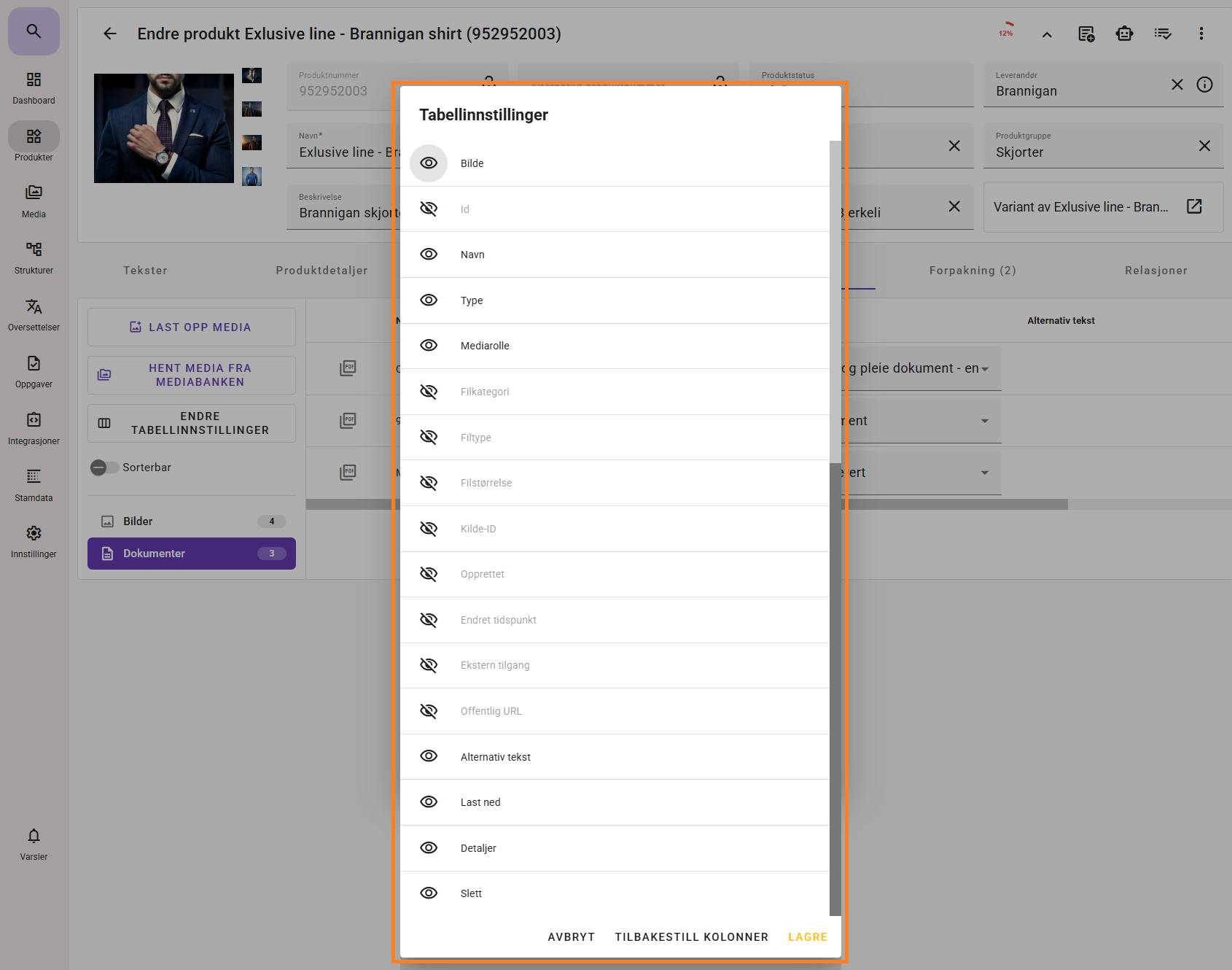 By clicking the column iconwhen you are in the tab for images or documents, you can customize the visibility of columns you want to display on the product.